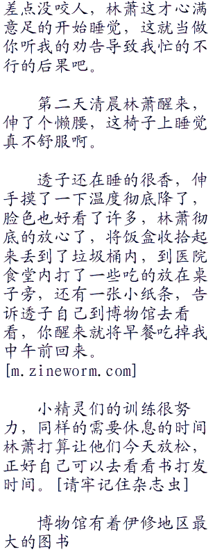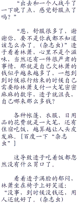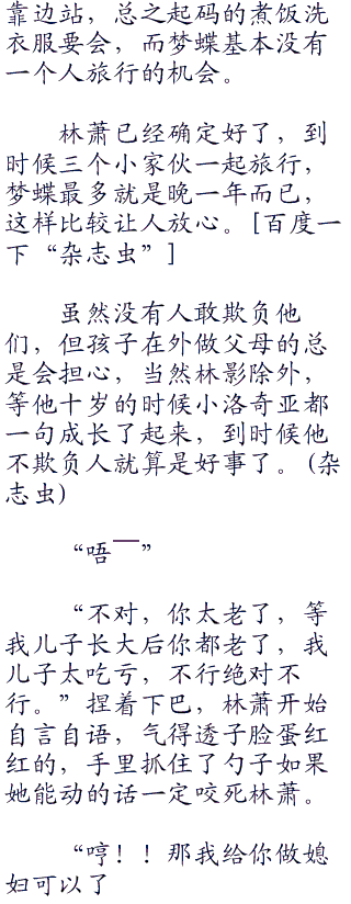 收起了闪电鸟,林萧直接回到了七宝市,至于小菊儿她自己会回来,不用自己去操心,这个世界可是很少出现什么劫色的事,因为搞不好你看中的软弱少女会忽然变成一头母暴龙,当然指的不是人变成暴龙而是小精灵忽然出现,三下五除二解决你要是小精灵实力强悍一点还有可能实力不强的话,抱歉你等着挨揍随后君沙抓着你去联络感情吧。