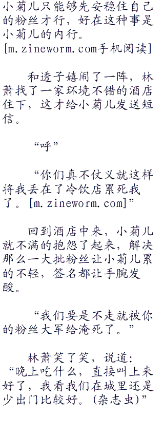 相比林萧和透子,小菊儿现在有点忙了,起码安慰粉丝,签名拍照是跑不掉了,有时候名气太大了也不见得是一件好事。