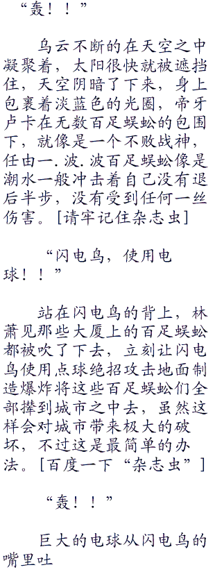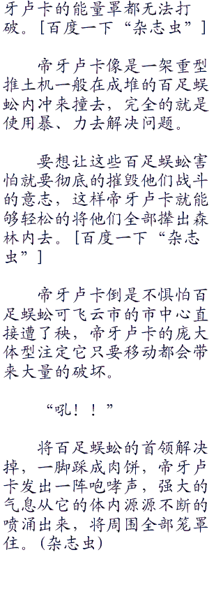 此时那只巨大的百足蜈蚣已经倒在了地上,帝牙卢卡解决它就和捏死一只小虫子一般简单,构不成任何的威胁,虽然周围的百足蜈蚣们都愤怒的攻击帝牙卢卡,但他们的攻击连帝