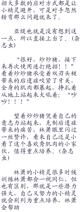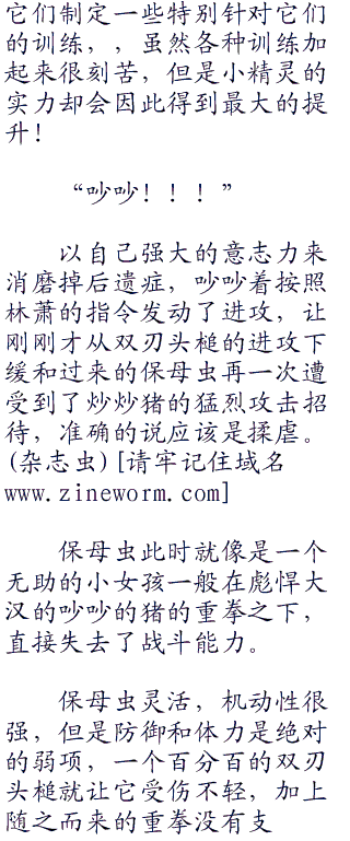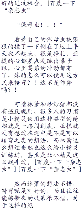 保母虫之前已经跳开来躲避了,可是没有想到炒炒猪会这样强行转弯,继续朝着自己冲来,刚刚落地,旧力未去,新力还不能提起来的保母虫只能眼睁睁的看着不怀好意的炒炒猪撞在自己身上。