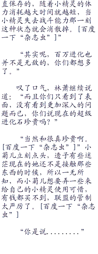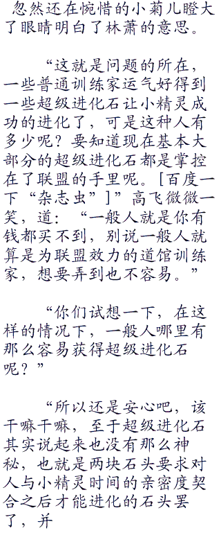 林萧微微一笑,没有继续逗透子,笑着解释道:“其实很简单啊,因为百万超级进化刚刚出现没多久,所以很多人对百万进化这一块是空白的,包括有些天王,他们很多时候都在处理一些事务或者在修行,对这方面是一片空白被战败也很正常啊。”