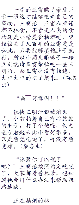 连接吃了三个三明治,林萧笑眯眯的看着小菊儿、艾莉丝、天桐三人似乎想说:“你们三个吃不吃呢?不吃我可是不帮忙的哦!”