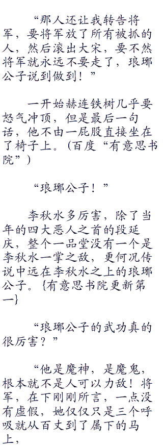 “告诉赫连铁树,放了他抓住的人,然后带着人滚出大宋,要不然他就永远不要回去了,我琅琊公子说到做到!”