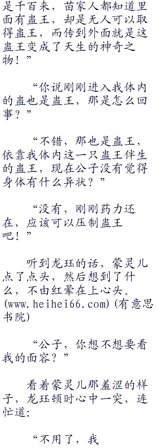 他倒是有办法去除了体内的蛊,但是蒙灵儿怎么办?一个妙龄少女恐怕要就此烟消云散了。