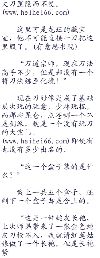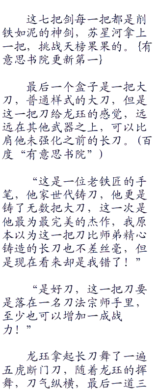 第三个盒子是七把剑,,全部都是紫金色的剑身,这些剑有软剑,包裹在金蚕丝剑鞘里面,好像一个腰带一样,有百斤重的大剑,剑阔身长。剑身不同,他们也有金玉银铜铁木布七种剑柄。