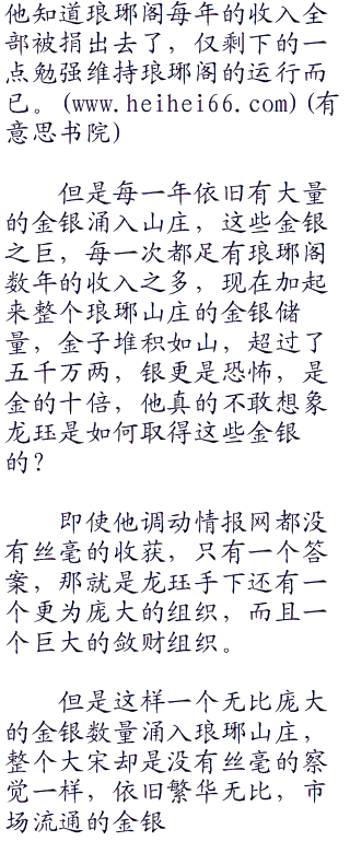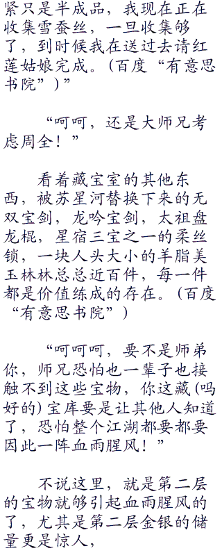 每一个密室分被放置了各种珍贵的物品,真是藏金库也在其中。依照左右前后顺序,第一个密室里面放着每年酿造的玄冰烈火酒,第二个存放收集来的各种珍贵木材,主要是金丝楠木与紫檀木,阴沉木,沉香木与少量沉香。