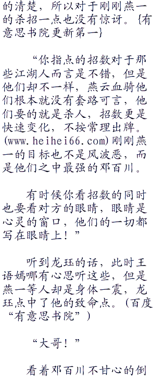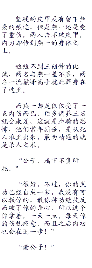 虽然燕一的内力武功看起来与邓百川,公冶乾差不多,但搏杀的实力却是相差太大了,她有九成的把握,燕一最后活着杀了他们四人。
