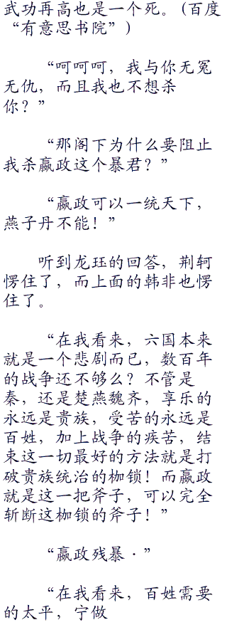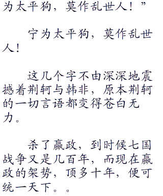 “论仁,燕国太子丹做的不错,但是这个世界需要的不是一个仁,要是太平盛世,我倒是愿意支持他,可惜他生错了这个时代!”