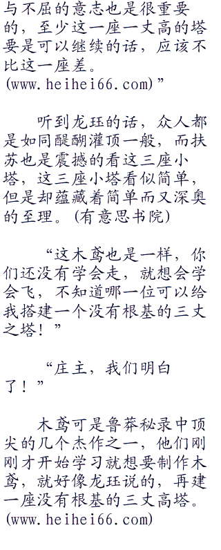 “一个人的基础是最重要的,多么扎实的基础决定了他的成绩,这一个不过四尺而已,但是这一个三丈封顶,甚至还可以继续下去,五丈也不是问题,扎实的基础决定了我们建多高的塔!还有无畏
