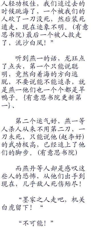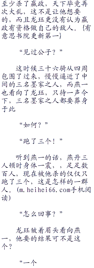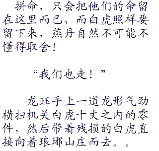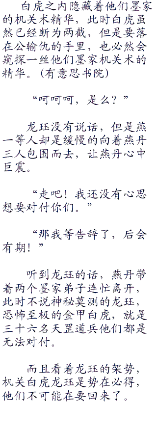 “我不需要活口,他们也不需要活着,从她们踏入桑海的一天已经注定了他们的命运。今天墨家之人可以不死,不过我倒想看看这机关兽的威力如何.」?”