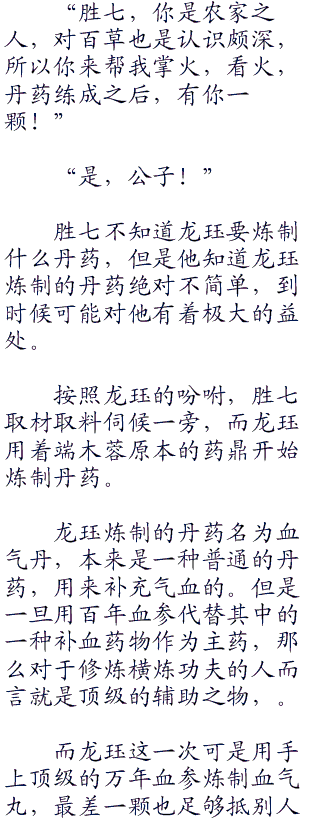 “你乃是农家之人,血含百草,蕴含着极为强大的力量,你是通过生死挑战,一点点激发血液中的百草之力,而这龙象神功可以激发你体内的百草之力全部融入气血之中。”