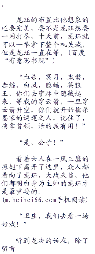 “有意思,告诉卫庄不要乱动,我记得你们流沙有一个逆流杀,其中墨玉麒麟号称可以幻化众生,让黑麒麟出动,潜伏在机关城捏,到了里面让他将这个放在外面的随便一个地方即可,没有我的命令,不准行动!”