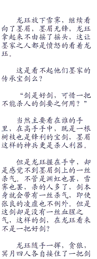 三剑插在龙珏的面前,众人都是眼热的看着这些宝剑?渊虹,剑谱第二,雪霁,剑谱第六,水寒剑,剑谱第七,墨眉虽然不入剑谱,但是也不比三把剑差丝毫。