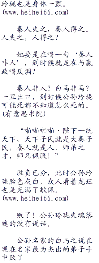 刚刚龙珏称赞了名家的白马之说,他们也在这一场败北,没有想到公孙玲珑又准备给龙珏上这一道菜。