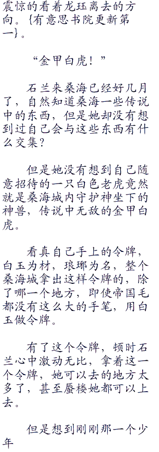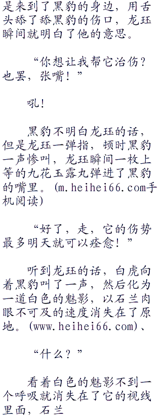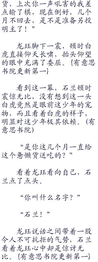 当日龙珏叫蒙灵儿断了白虎一个月的口粮,但是白虎的灵智岂会在乎这些,反倒是白虎三个月都没有再回山庄。