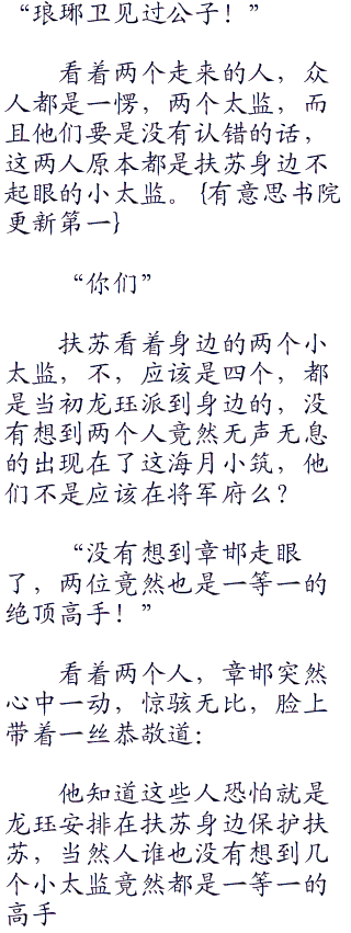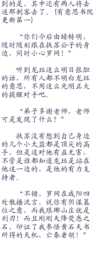 另外一层,一旦嬴政之后,那么他琅琊就是最为锋利的利刃,谁敢与扶苏想争,琅琊山庄兵锋相指,杀戮而临。