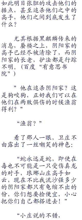 “我看到他倒像是在找人,他这几天不是一直再杀人么?以他的身份何必亲自带人出手,明显是在逼阴阳家的人出来,他看到我们这里没有阴阳家的人就自己走了,这一把长刀不过是警告我们不要跟过去,自找麻烦!”