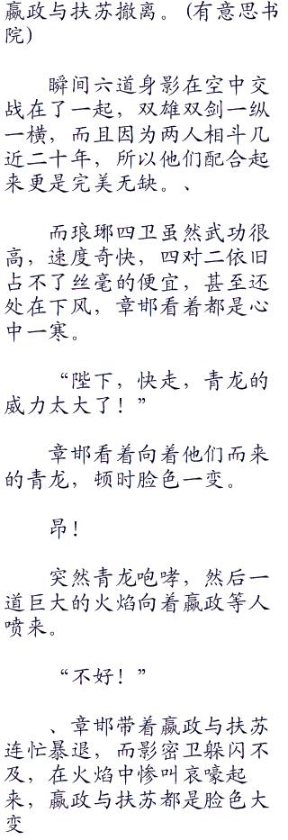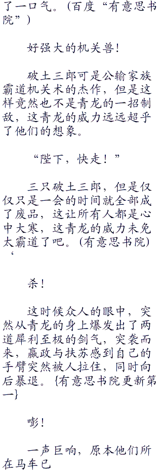 这时候守卫的将军看着前面威力强大的机关兽青龙,几乎就是横扫而来,所过之处,挡在他前面的秦军没有一个可以挡住他他一击的,都被火烧而亡。