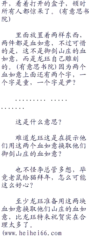“赵云,豆豆,珠儿,过几天御剑山庄要准备接位大典,你们帮我把血如意取来!”