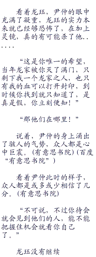 不过琅琊阁与他们御剑山庄的恩怨却是真的,龙珏嚷着为龙家报仇,而尹仲也没有丝毫的反驳,甚至几次口风都证明了尹仲以前却是灭过一个龙家!