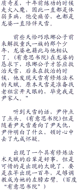 “童氏一族乃是天地间最为神秘的一族,他们具有修炼法术的天赋,这是常人难以企及的。我也没有想到尹家五百年没有人修炼法术,五百年后竟然出现了一个具有修炼法术天赋的人,而且天赋还是很高。天赋,你的天赋是什么?”