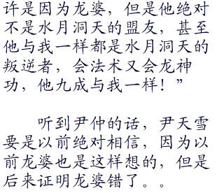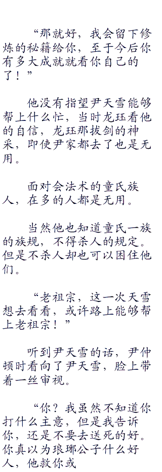 “老祖宗名讳原为童尹仲,因为修炼童氏一族的禁忌武学龙神功而被放逐,后来老祖宗带兵追杀童氏一族所以五百年来,老祖宗一直追查童氏一族与龙家,而我尹家原本也是姓童,而不是尹!”