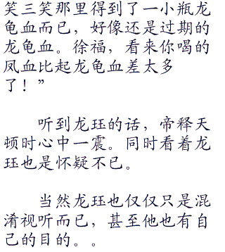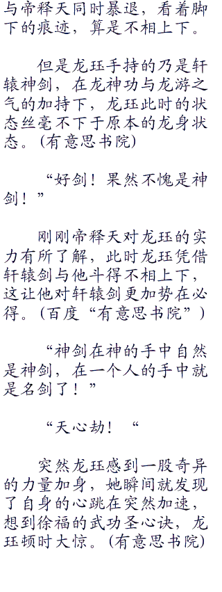 将近千年的内力可不是吹的,而且尹仲因为受伤,武功的进步自然也没有帝释天快,更何况帝释天比尹仲的年纪还要打上七八百岁。尹仲唯一可以对抗帝释天的功夫就是龙神功与法术。龙珏也是一样,而想要战胜帝释天,除非帝释天给他时间施展强大的法术。