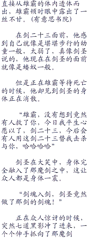 剑圣双手擎天,瞬间七把魔剑齐齐颤抖,长剑飞起,七把魔剑随后齐齐插入了剑圣的后背。