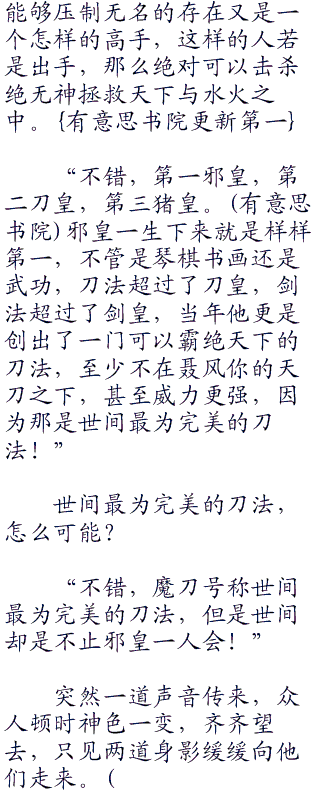 “琅琊百城繁华无比,但是其中还有你们没有看到的一些东西,十数年来这里都是一些武林高手的禁地。当年琅琊山庄出动一百零八血卫灭杀了一百多个大大小小的门派,所以琅琊白城内现在剩下的都是一些小鱼小虾而已,就是高手也是归隐或者担任一些城内的守护者!”