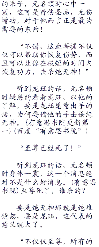 龙珏与尹仲来到无名的面前,看着无名的脸色,龙珏随手拿出了三颗血红色的果子。