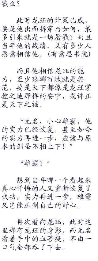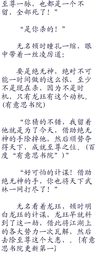“不错,琅琊山庄高手如云,昨天我亲眼见到你们所说的那个绝无神在无双的手下一掌大败,江湖上的任何高手在琅琊山庄的面前都放佛是一个笑话般。而且告诉你们一个我半年来的一个惊人发现,每一个黑衣刀客使用的都是一种刀法,便是生死魔刀!”|