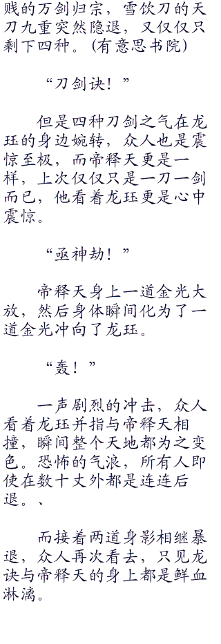 听到龙珏的话,帝释天全身功力暴起,手上磅礴的内力再次凝聚了剑宗绝学万剑归宗,随着他的一指,一道道恐怖的剑气绷指而发。