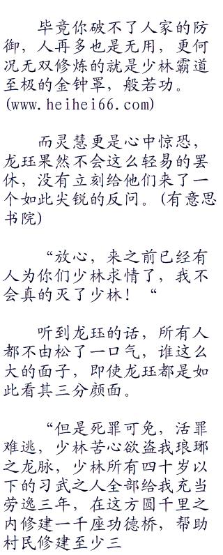 他丝毫不怀疑无双有屠灭少林的少林的实力,魔刀不可以,他不可以,但是无双可以。因为无双金钟罩的防御无人可破,这样无双杀多少人都利于不败之地。少林的高手再多都要死在无双的掌下与刀下。