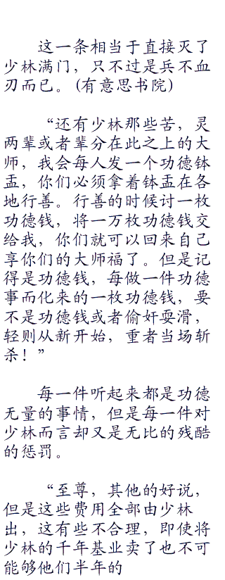 “至尊应该不会灭门少林的,少林武当虽然封山百年,但仍然是正道领袖,武林泰山北斗,一旦少林武当灭门,武林必乱,这点不是至尊希望看到的。但是至尊也不会轻易了解此事,毕竟牵涉龙脉,帝国之根本!”