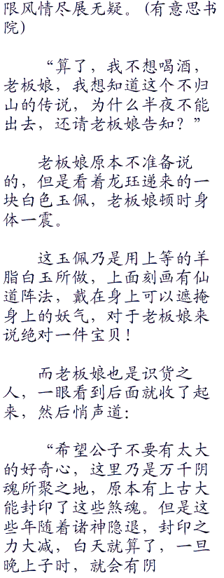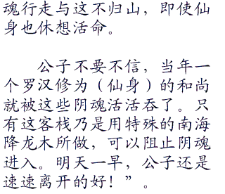 “当然,欢迎,欢迎,只要客观付得起钱,住上十年八年也不是问题。只是子时之后千万不要出来,这里的名字叫做不归山,夜晚子时,即使仙人出来也是有出无归!”