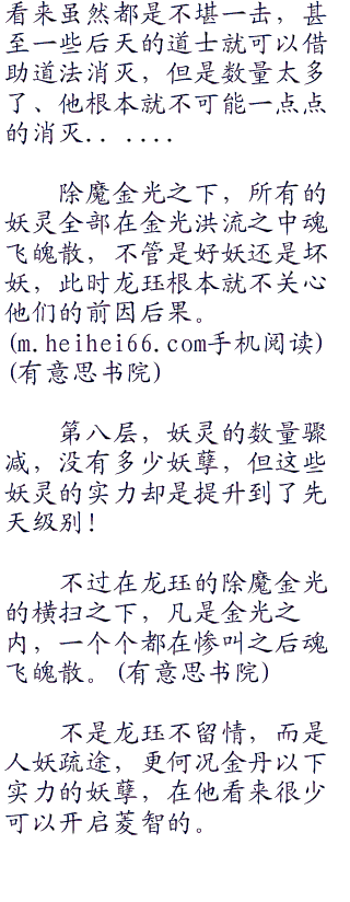 进入锁妖塔内,无尽的凶煞之气丝毫不下与幽玄之境,而是这还仅仅只是最上面的一层。这里游荡的都是一些没有化形的妖灵,当时重楼拿去魔剑之时,也就这些出来的最多,也被他的天网直接覆灭,根本就毫无还手之力。