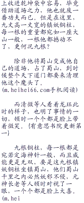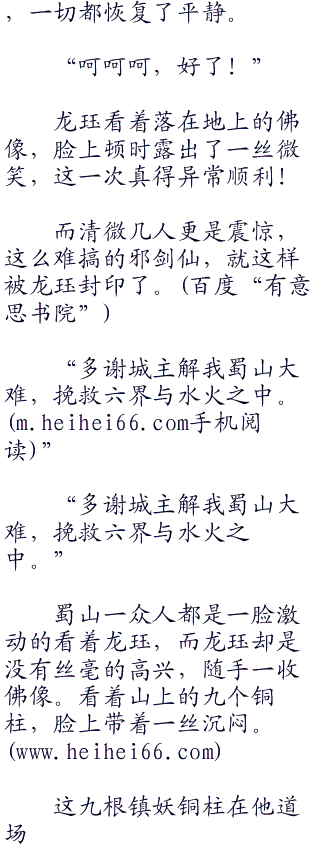众人只见龙珏将这佛像投入镇妖铜柱之内,所过之处黑气避让,就好像是遇到了什么天敌一样。而且一旦黑气在三尺之内必然光明大方,众人都是一阵惊奇,这东西真的能够克制里面的邪剑仙。