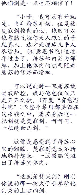 与焚寂这么多年了,屠苏还是第一次听到焚寂剑灵的事情,他以前就认为是一个无恶不作的剑灵而已,没有想到竟然是超脱了人间的仙神。.首发