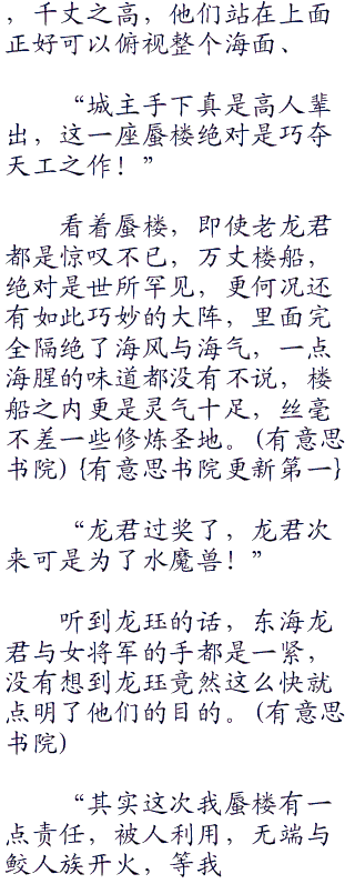 登上了蜃楼,老龙君才清楚这上面的奢华,处处都是鎏金纹饰不说,而且九根镇妖铜柱更是让他都差点献出了原型。