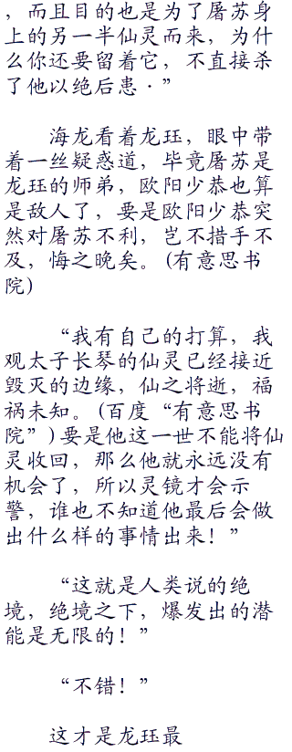 看着龙珏,欧阳少恭看着龙珏也是心中惊疑,因为龙珏的琴音绝对是世间少有,天下少有人可及,这样的人他实在不相信会是哪一种炼制魔甲之人。