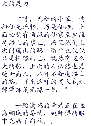 “真的存在这么大的船,屠苏,这不会传说中的蜃所变吧。我听说还有有蜃,专门变成人类的城市,然后诱使人迷失在其中·”