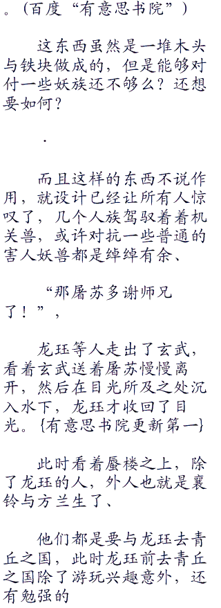 “屠苏,这玄武机关兽可以帮助你直接从海底避过雷云之海,等过了雷云之海,你在以御剑术而行。依照玄武的速度,至少需要十天的时间才能回到大陆,而你要是御剑的话,一个时辰的时间就足以从雷云之海回到大陆。可惜这东西也正在研发阶段,只能用来袋水中代步而已,毕竟对付一些小妖还可以,一旦遇上有神通的妖怪就跟破烂一样。“
