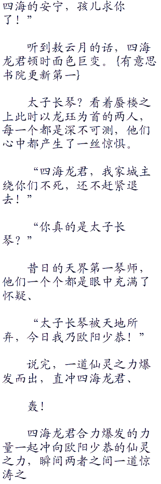 亿万神剑瞬间爆射进入海中,在敖云月的震惊之下,一声声爆响,也不知道下面的四大龙君怎么样了。