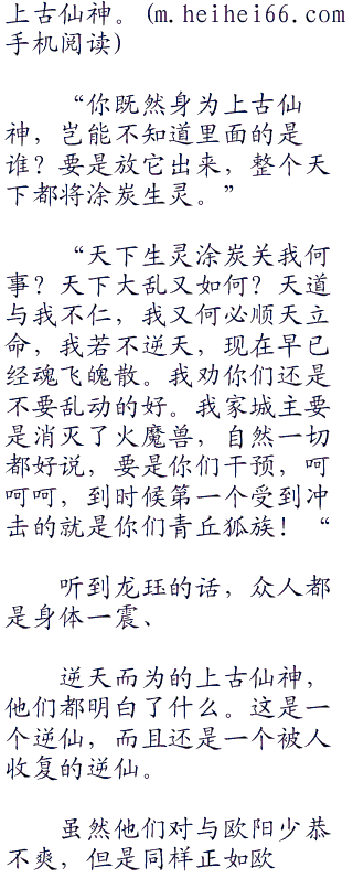 她不是其他的妖兽,她是太古火魔兽,可以活要论年纪,整个天下间都是屈指可数。要论修为,要不是她没有恢复元气,加上这一片空间天道的的压制,她解决龙珏不用第二招。