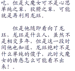 或许火魔女的火焰很厉害,媚术也很厉害,但是招数上她终究不是龙珏这个高手的对手。一个被封印了无数年的魔兽,即使有经验也给时间给磨没了。