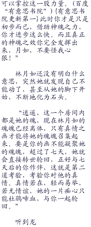 即使赵灵儿看着上面栩栩如生的林月如都是脸上带着一丝微笑,没有想到李逍遥的进步竟然如此大,不到半天的时间,此时十张画已经出来了。
