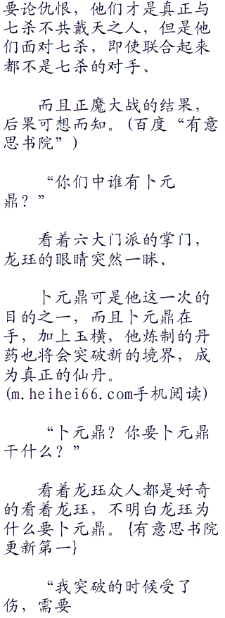 众人也都被龙珏反驳的无话可说,要论仇恨,龙珏顶多死了一个师傅,而且还是被门中叛徒所杀,不是七杀所杀。但是他们死在七杀手上的人可都是成千上万的前辈,师叔,师伯,还有弟子啊。