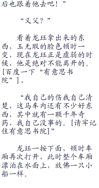 “我们现在已经在马车的上空十丈之处,无暇,用你的内力稳定这车厢,然后落入水中!”