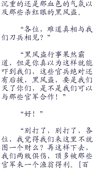 “呵呵呵,大家都不要动怒,其实这位黑风盗大爷说的不错,没命花的钱那不叫钱。但是那个,大爷···那边锦衣卫在你们来之前可是说了,黑风盗的赏银可是不少,不知道有多少?` ~?”