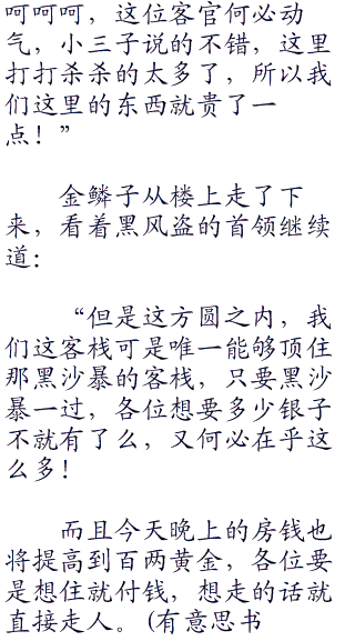 “这里我黑风盗包了,再过一天就要来黑沙暴了,各位朋友给我黑风盗一个面子,请移驾不远处的驿站!”